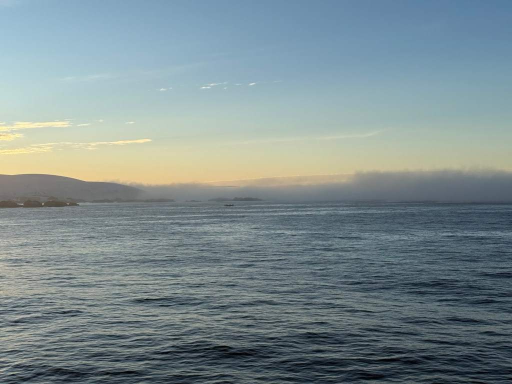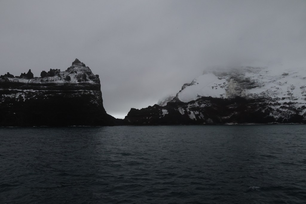 The birds were the first harbingers that the land was so close by. Then we started seeing icebergs, and then the island emerged shrouded in clouds and fog.