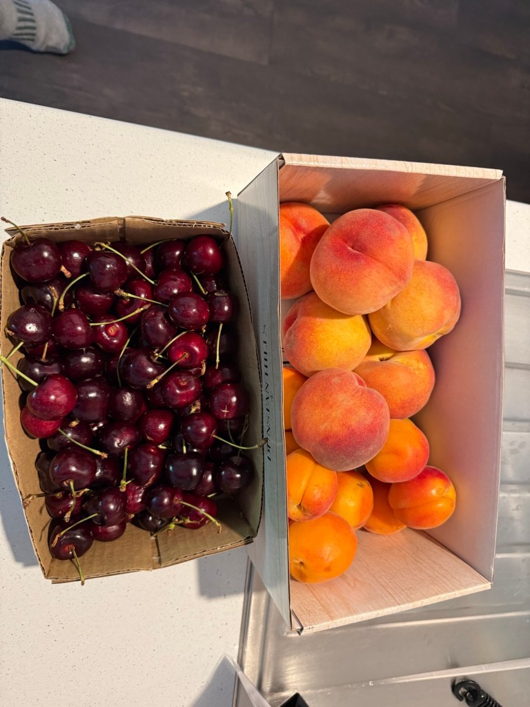 Our next stop was at town Fairley. We bought 2 pies for our dinner from famous Bakery shop. We also bought locally grown apricots, peaches and cherries.