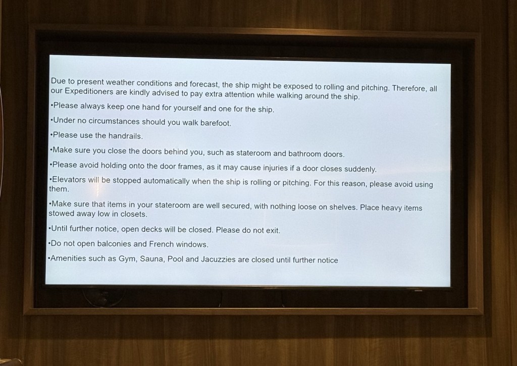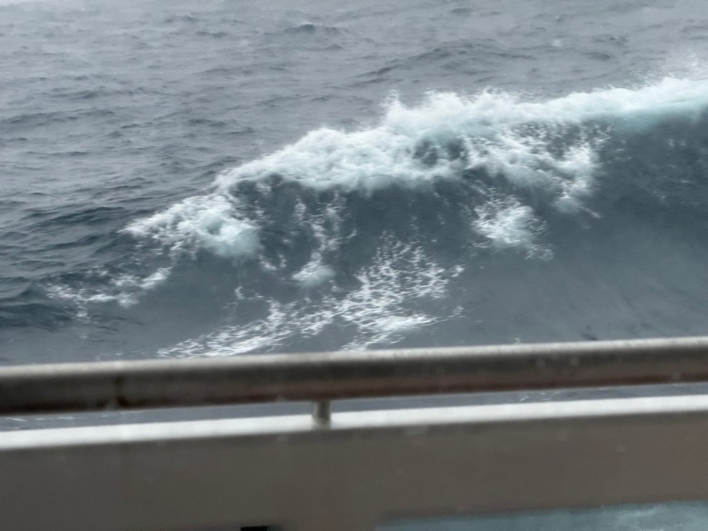 And as the low pressure system and storm heading our way, we left Campbell Island and started heading to Macquarie Island. The swells are big today about 12 ft high (rogue waves were almost 15 ft high) and we have been told to be careful as we walk on the ship.