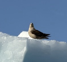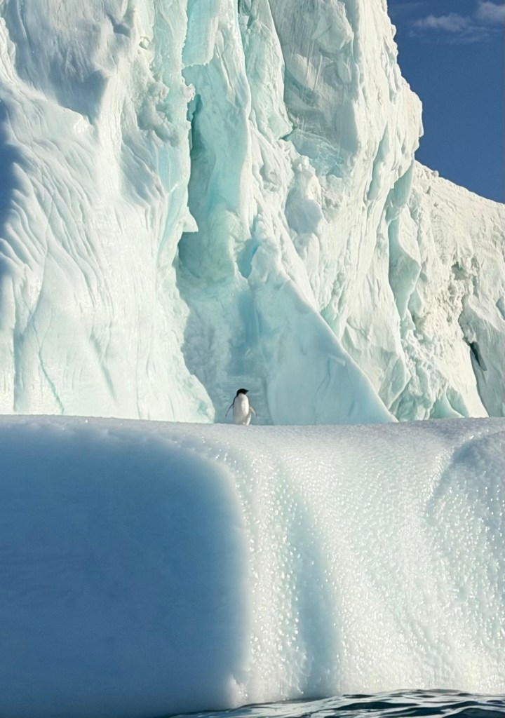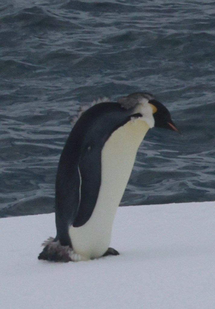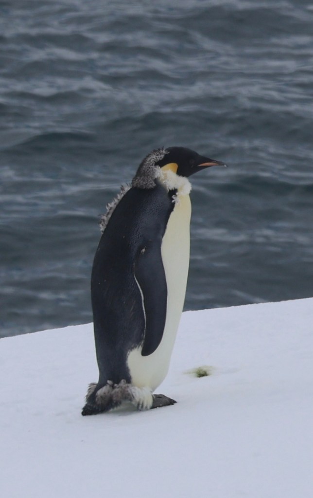 Our ride was interrupted soon for an impromptu landing for a surprise. While we were zodiac cruising, Howard and a small team went exploring in search of Emperor Penguin and they found one. So we landed on a very difficult spot and climbed a ridge with tricky footing, snow and no trekking poles to see this lone Emperor Penguin waiting to complete his/her catastrophic molting.